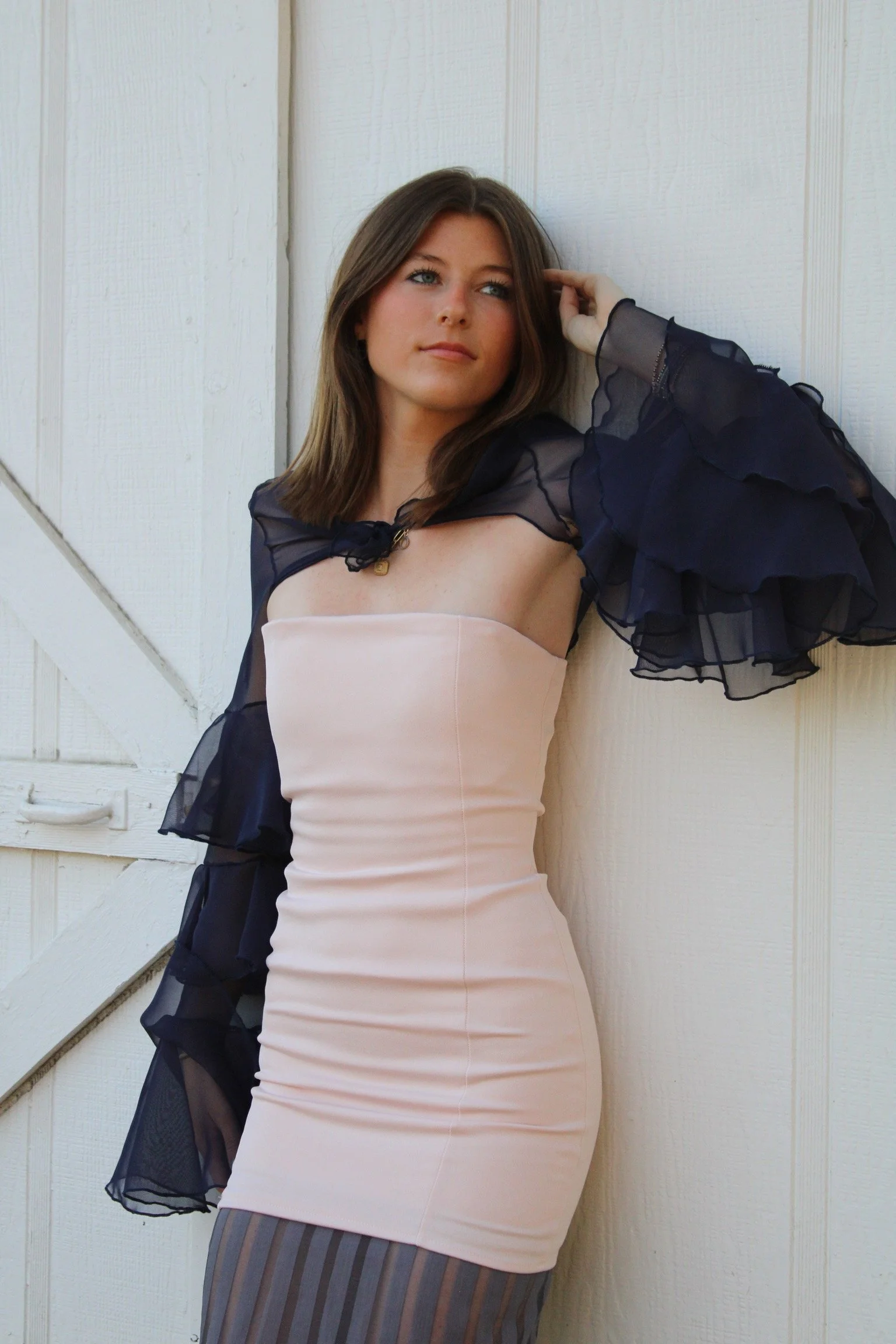 400 Oxford Street was my personal addition to the collection. It is an effortless look that embodies the femininity of the brand Chloé. It’s designed to flatter the female form with elegance, featuring a form-fitting strapless mini dress with an attached striped organza underlay skirt. The dress is paired with a chiffon cardigan that has sleeves featuring Chloé’s signature chiffon ruffles. Layering chiffon adds a bohemian element that elevates the look with a sense of movement.
